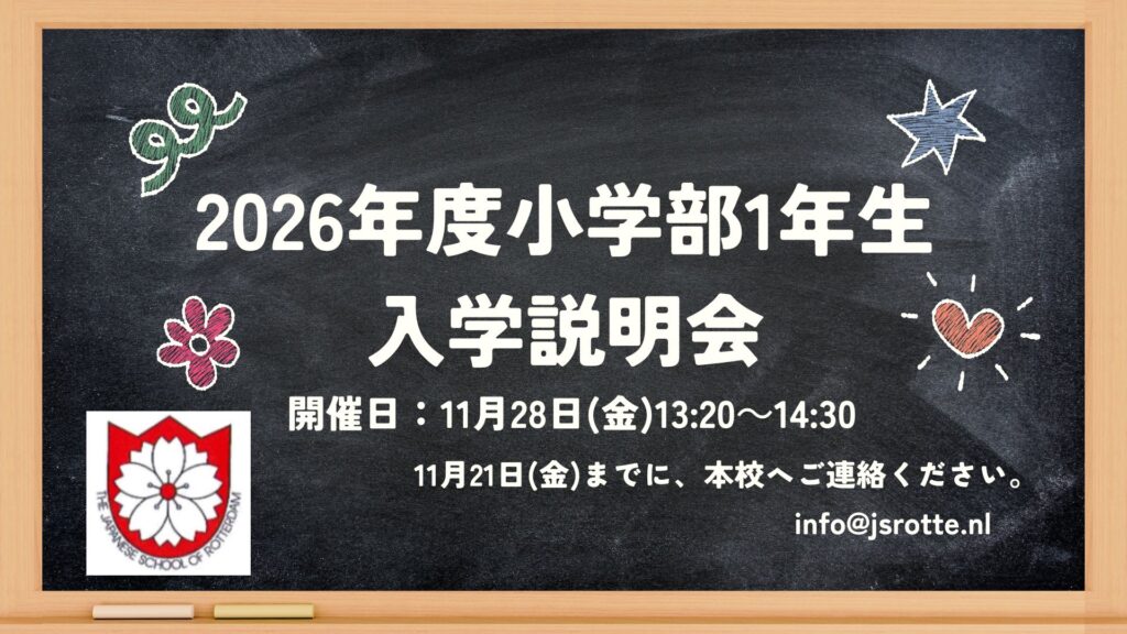 2026年度、小学校1年生になるお子様と保護者様を対象に入学説明会を開催いたしますので、ご案内をしております。
