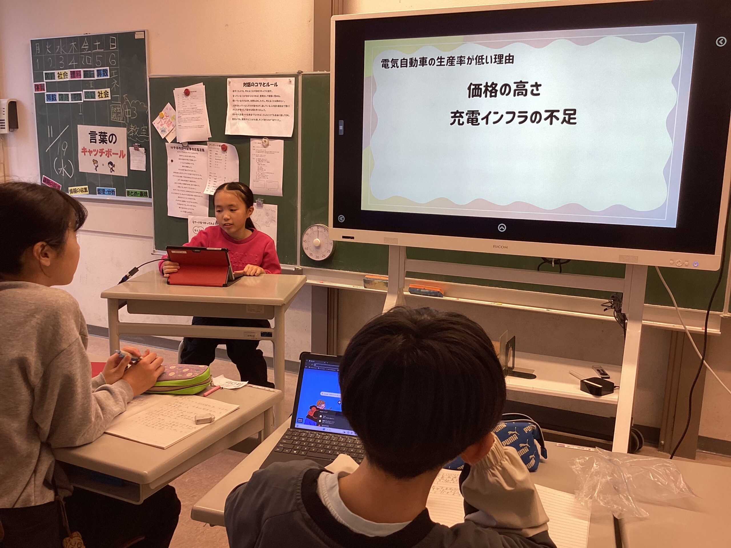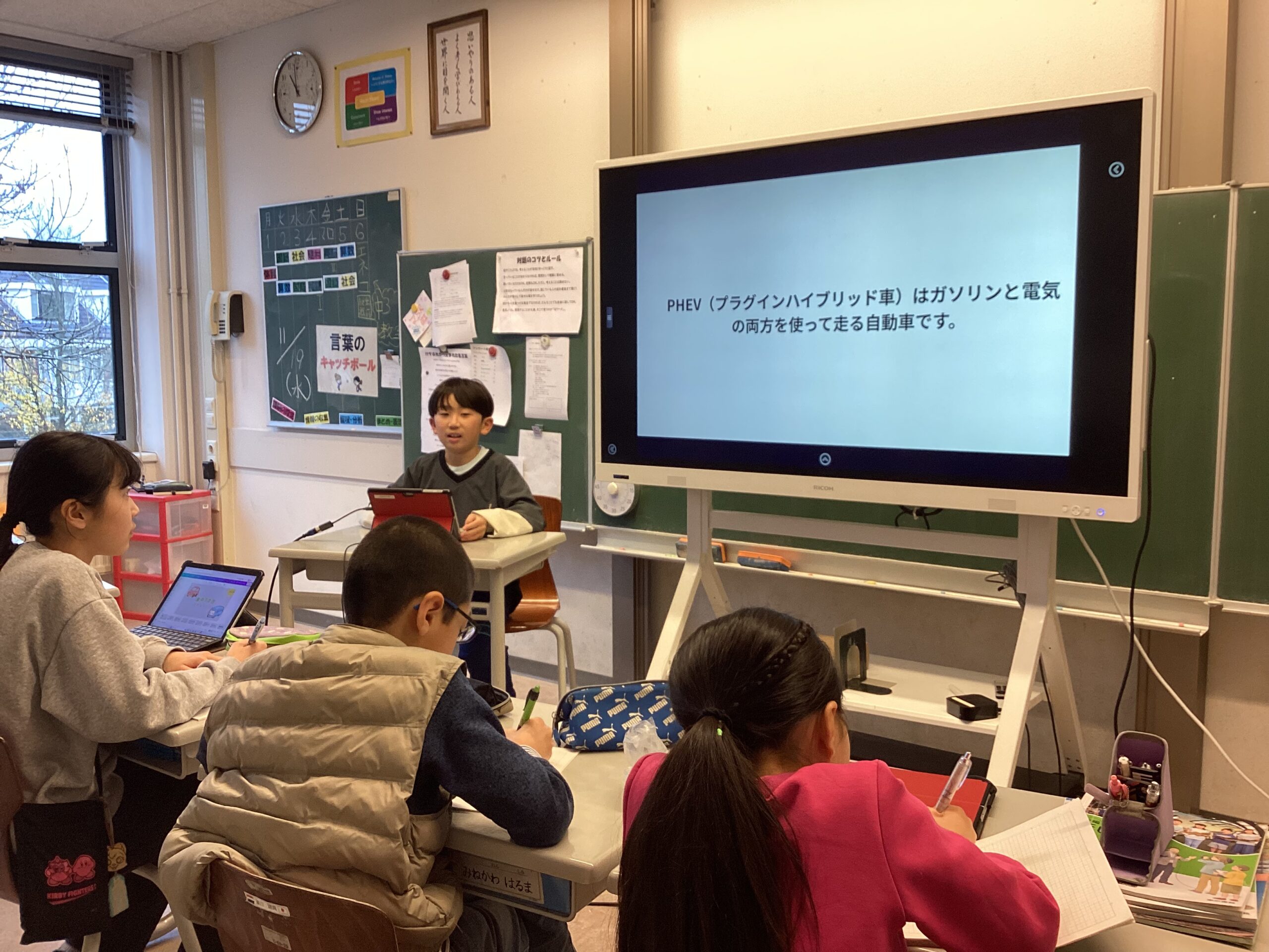 子どもたちの発表にも電気自動車の魅力や現在の課題、国の支援や対策などが出てきました。