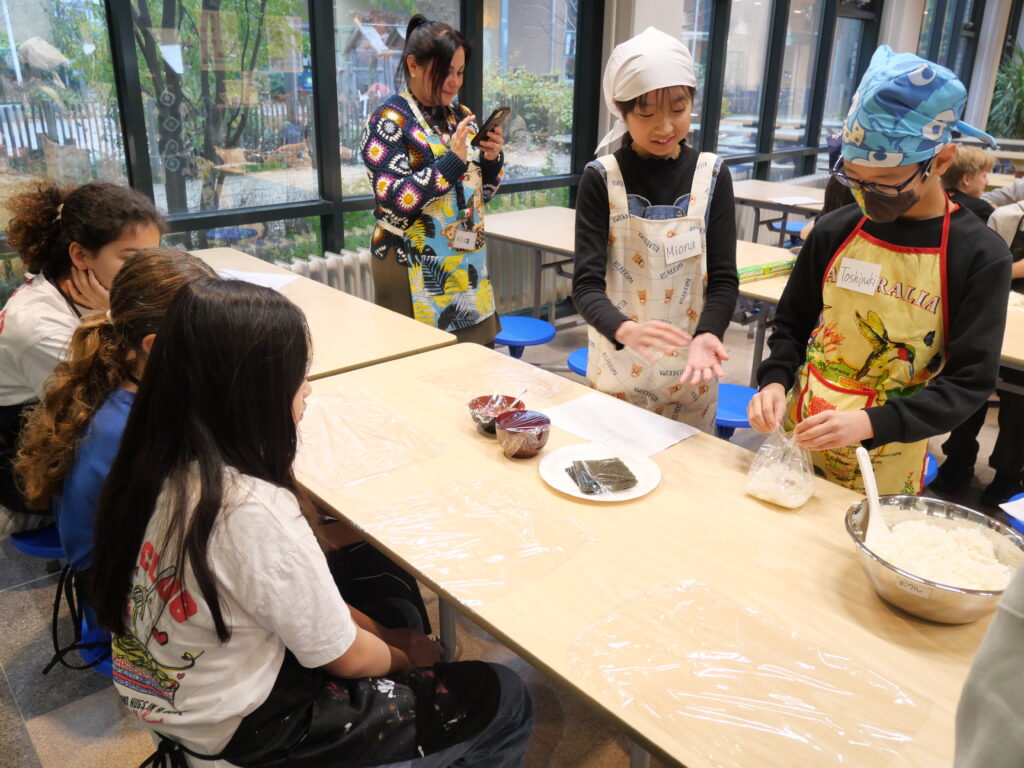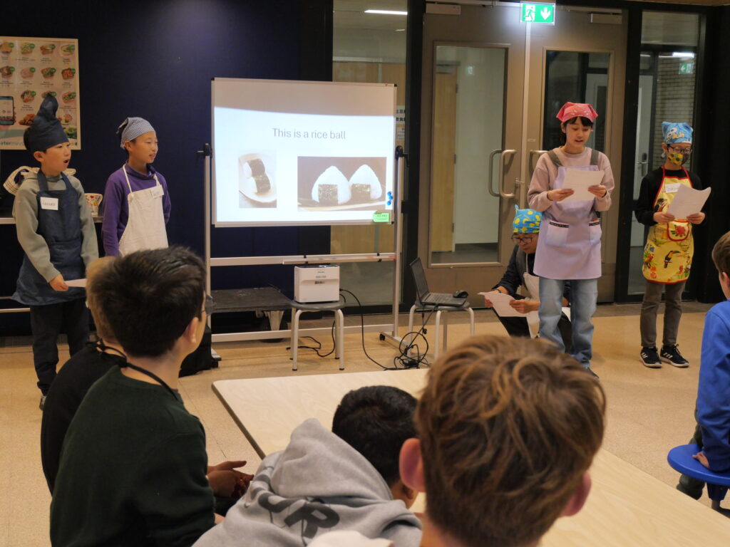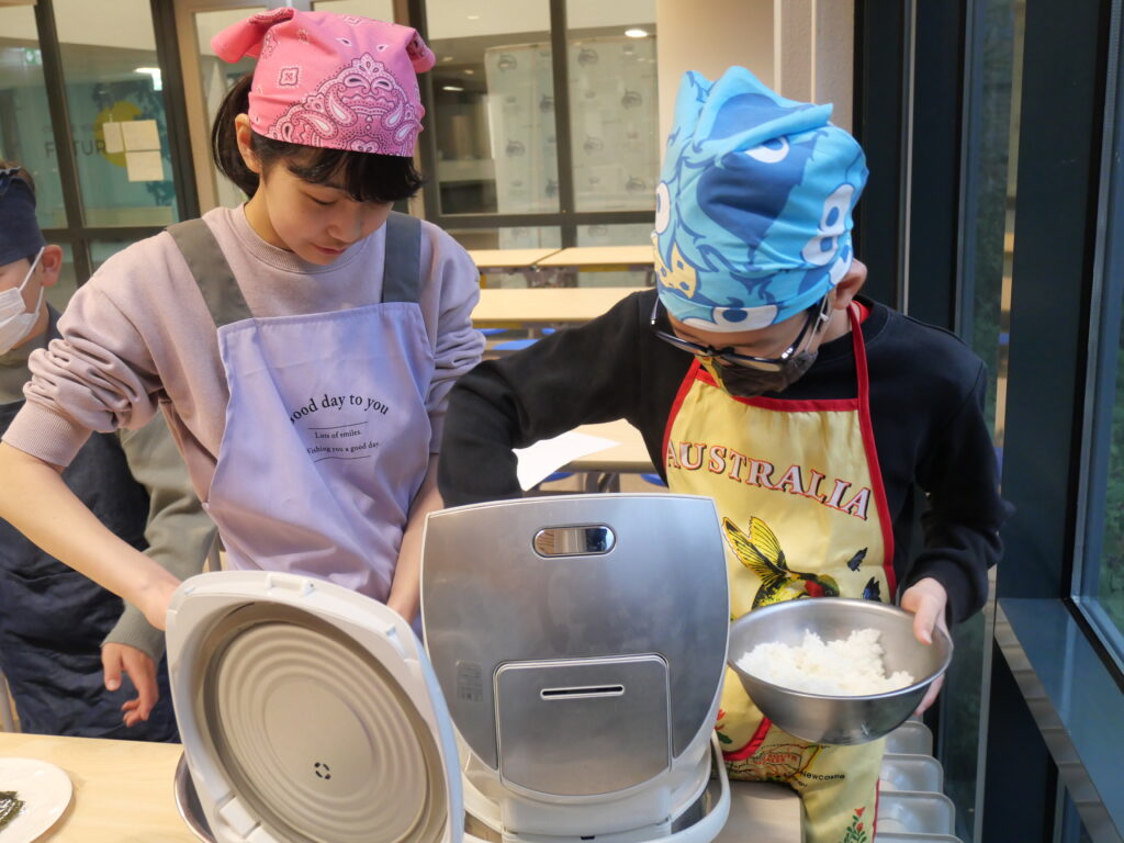 社会科でお米作りや食料自給率の学習を通して、米や日本食の魅力を再発見した子ども達。今回は、小学校5,6年生とNAISR(インターナショナル校)の生徒達で、おにぎり作りの交流学習をしました。